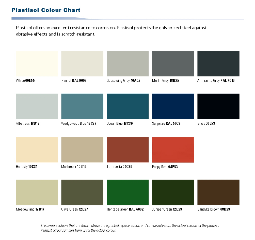 A wide range of finishes are available with the Galvanised Steel Finish being the most popular. Other options include PVC Plastisol